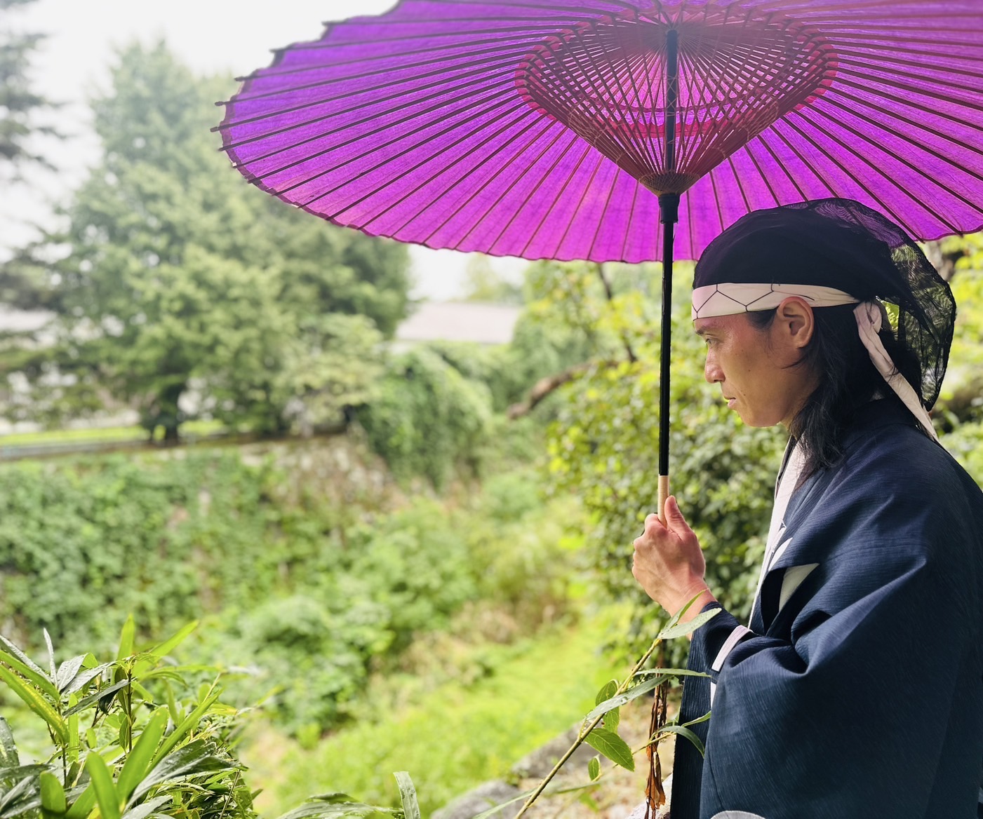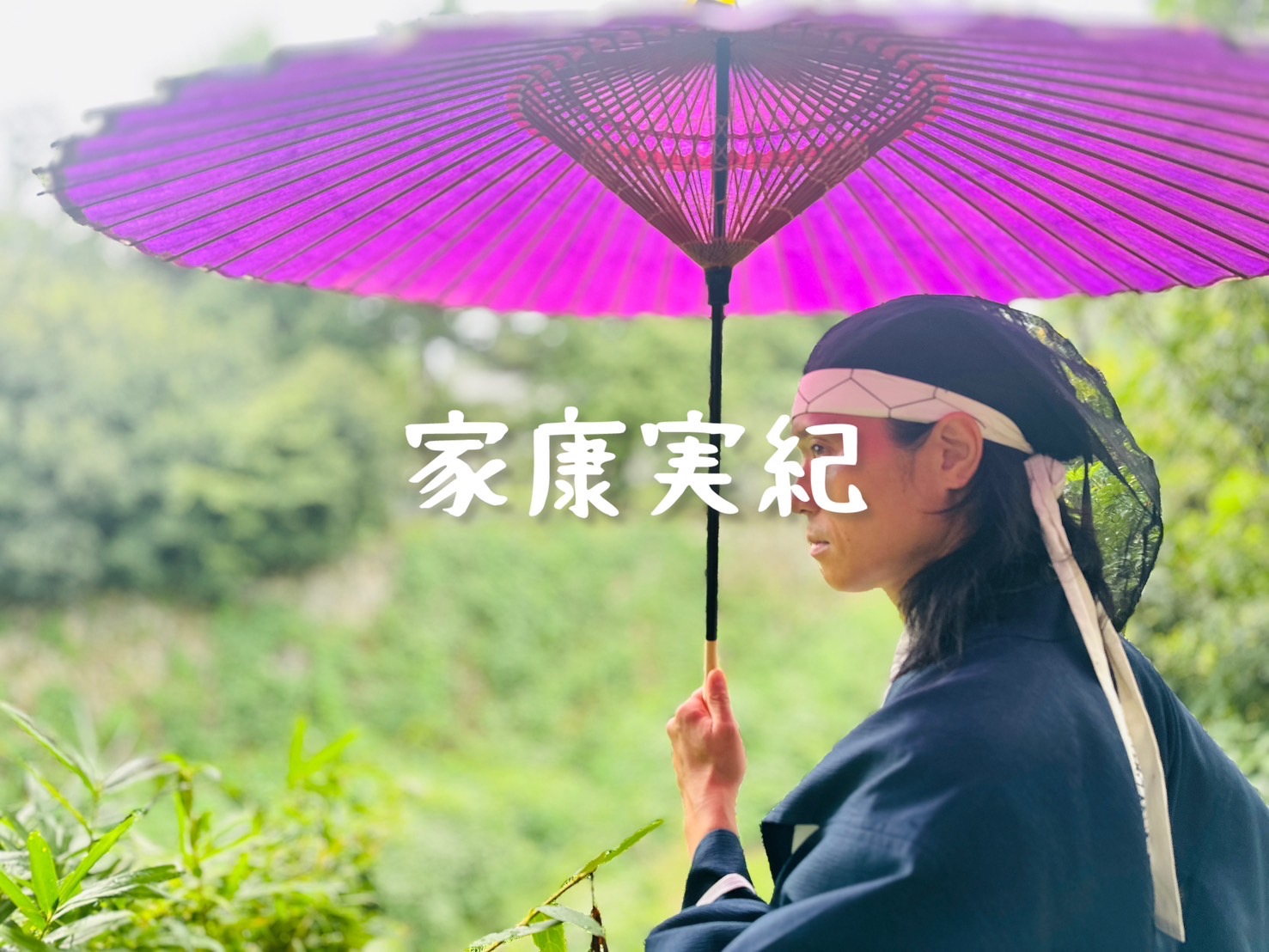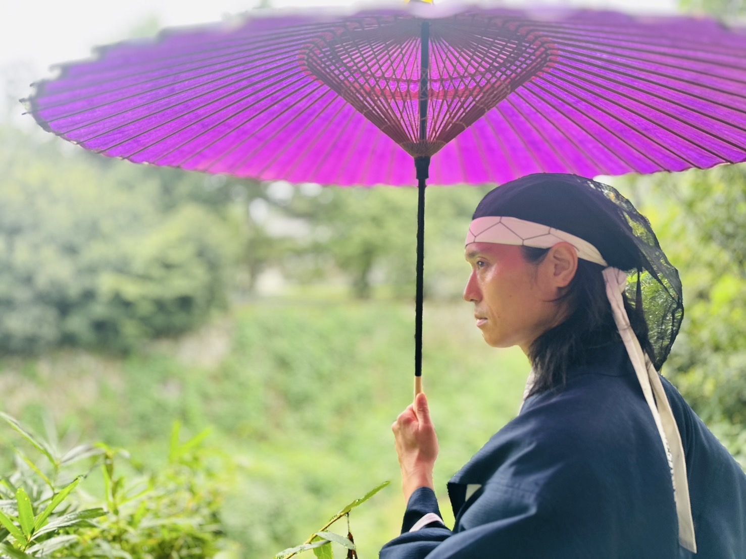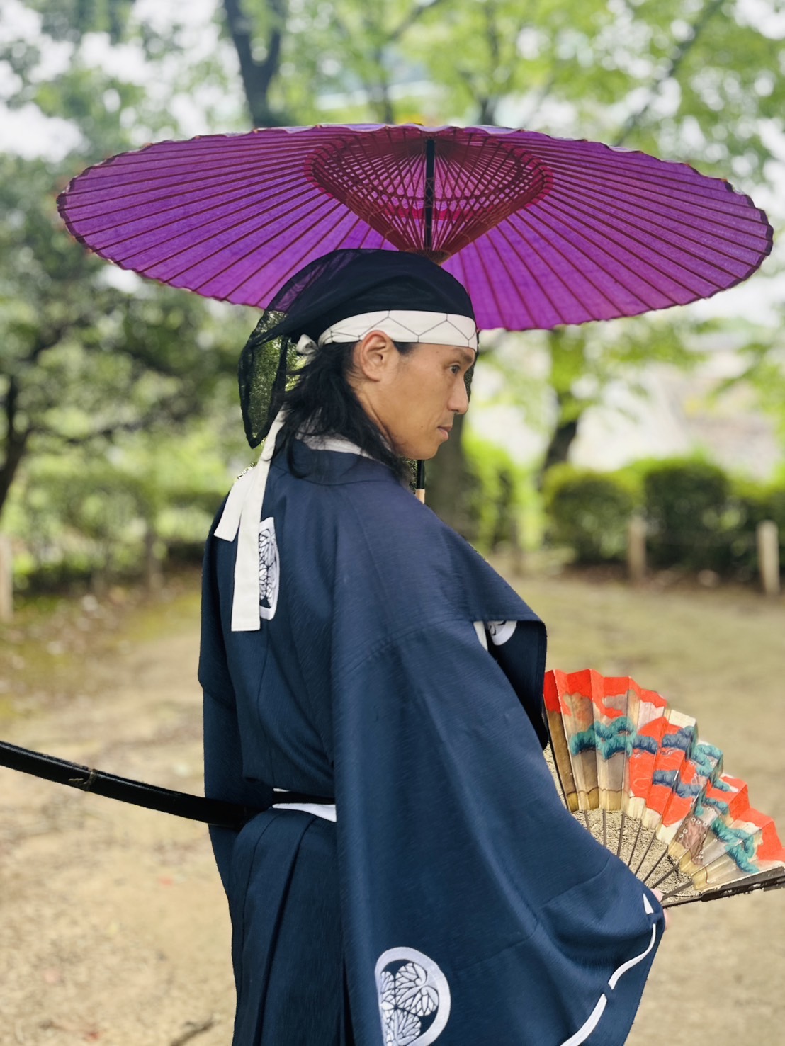 和傘のお色に直垂姿、お扇子美しい色合いにございますな!