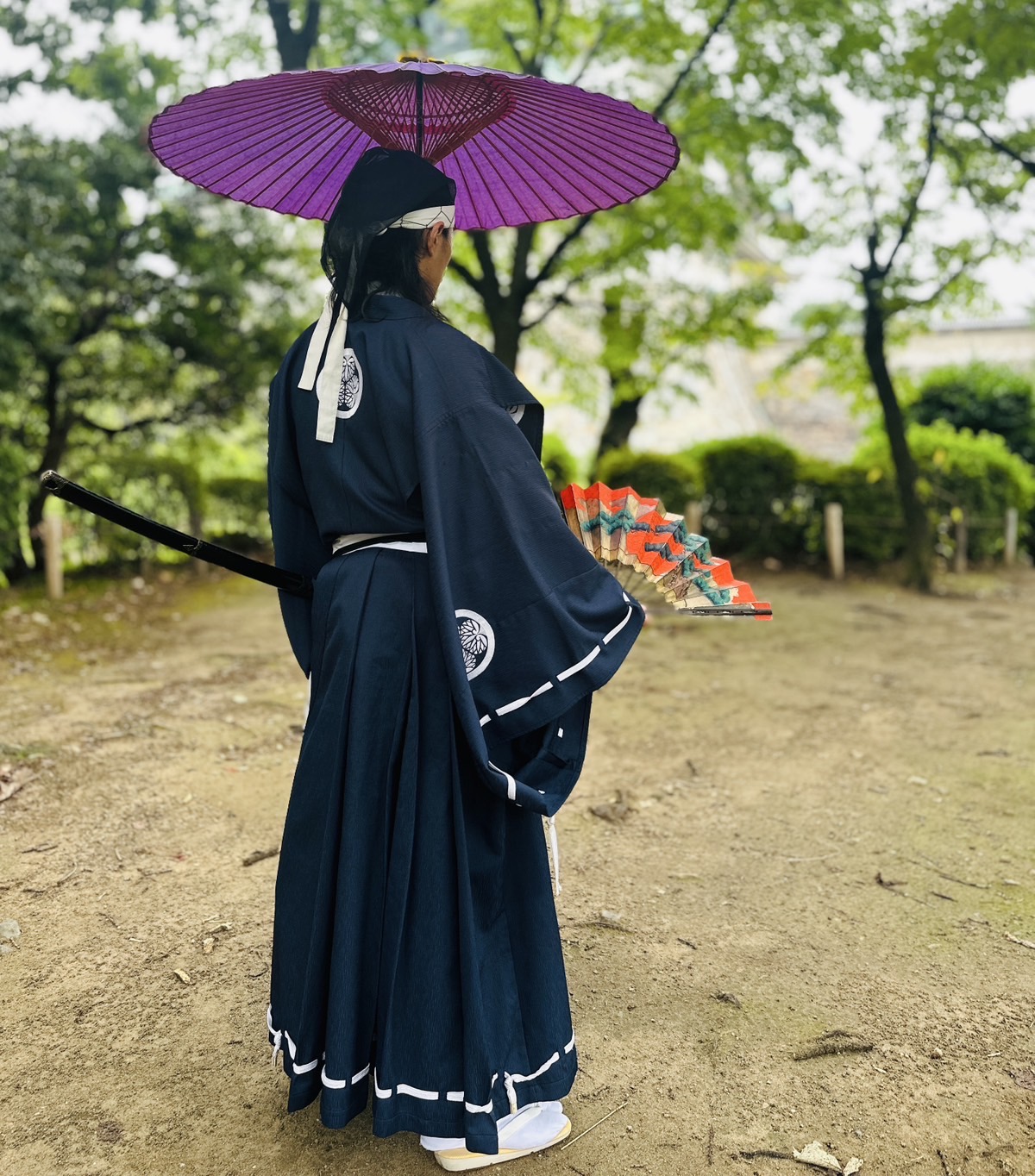 直垂と扇の色が緑に映えて美しいです。