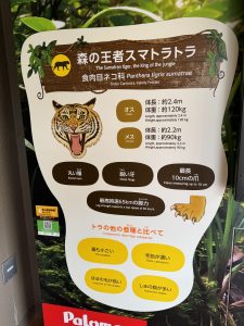 スマトラトラは他のトラに比べると、トラの中では最も小柄で、毛色が濃く、ほほの毛が長くて、しまの数が多いらしい。