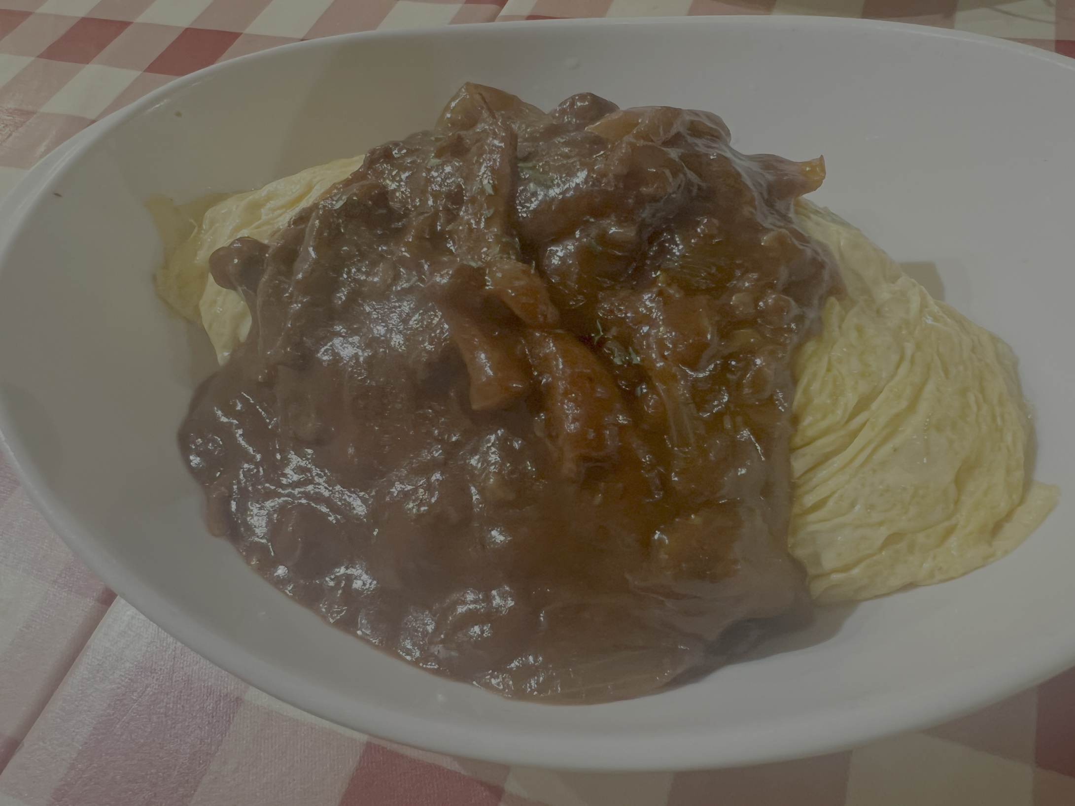 じっくり煮込まれた牛すじハヤシソースが絶品、玉子に包まれた飯はなんと香ばしいガーリックライスが特徴的!