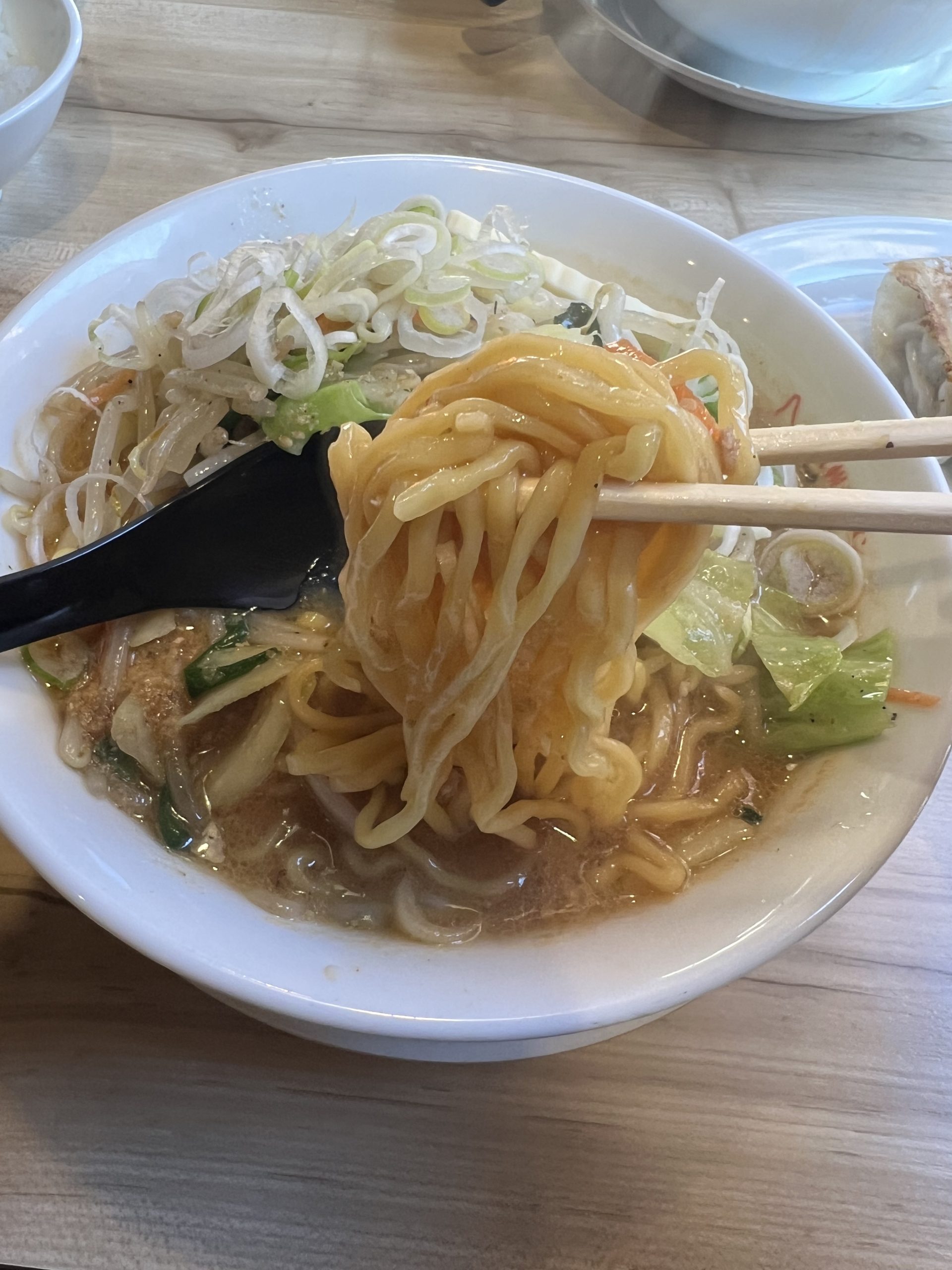 これこれ!北海道味噌ラーメンといえば黄色麺、これは多加水麺の特徴であり、コシ、もちもち感がある麺なのである。