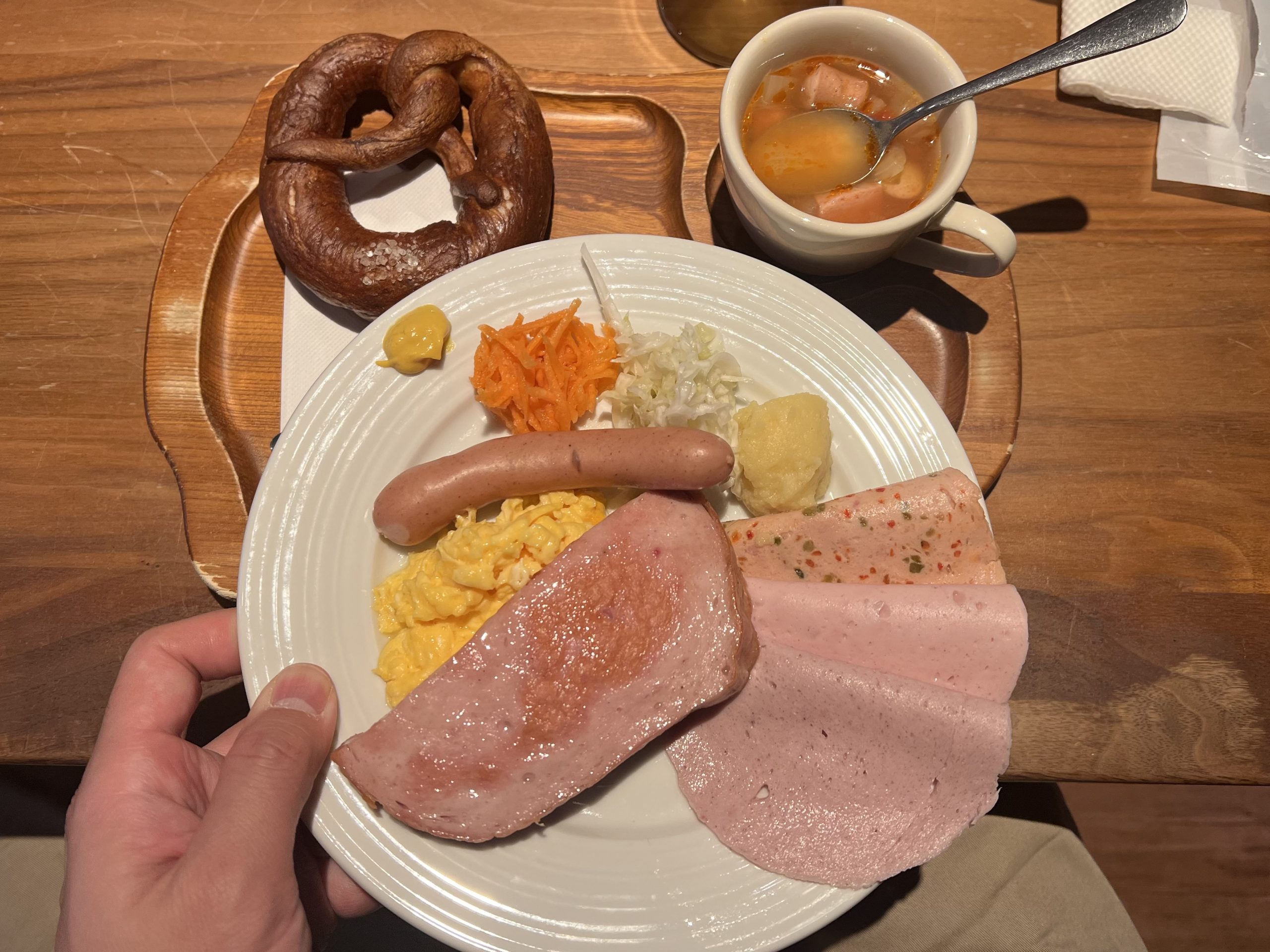 外はこんがり香ばしく焼け、中はもちもちプレッツェルと加工肉で気分はドイツ人である