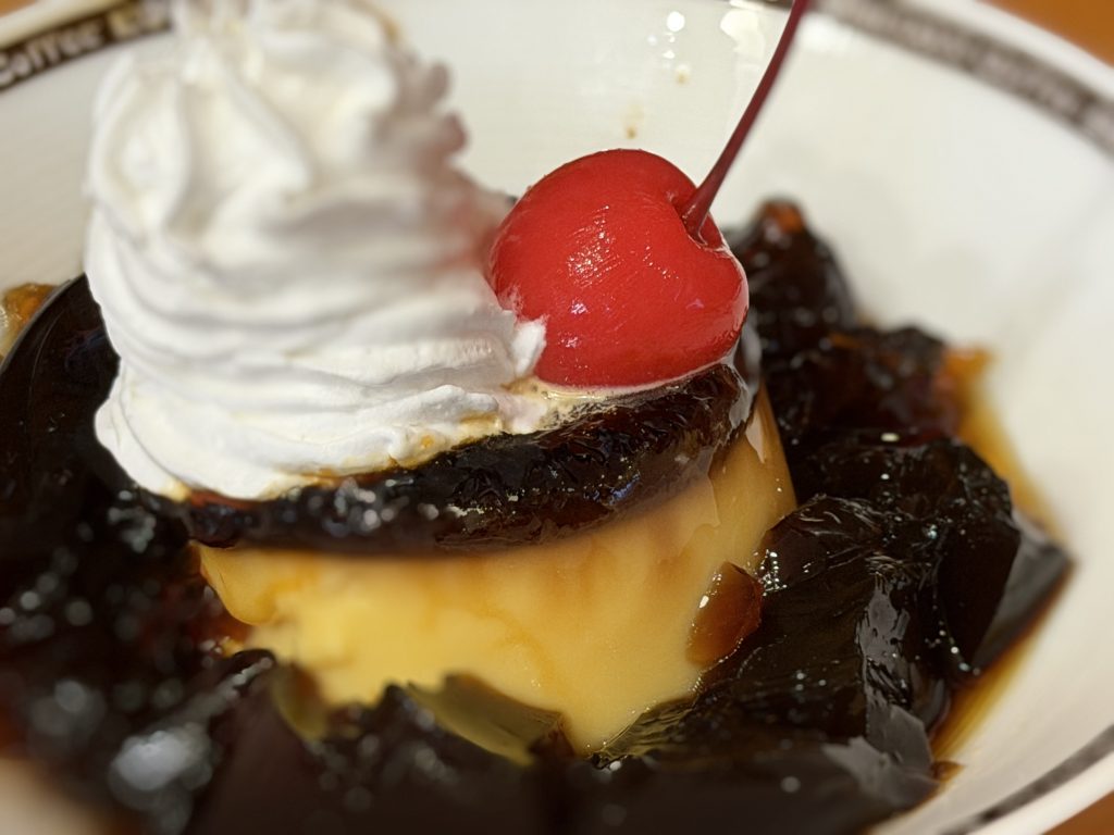 黒い珈琲ジェリーの海に浮かぶ黄色いプリンと白いホイップクリームに赤いさくらんぼが色も相まって映えまするぞ!!!