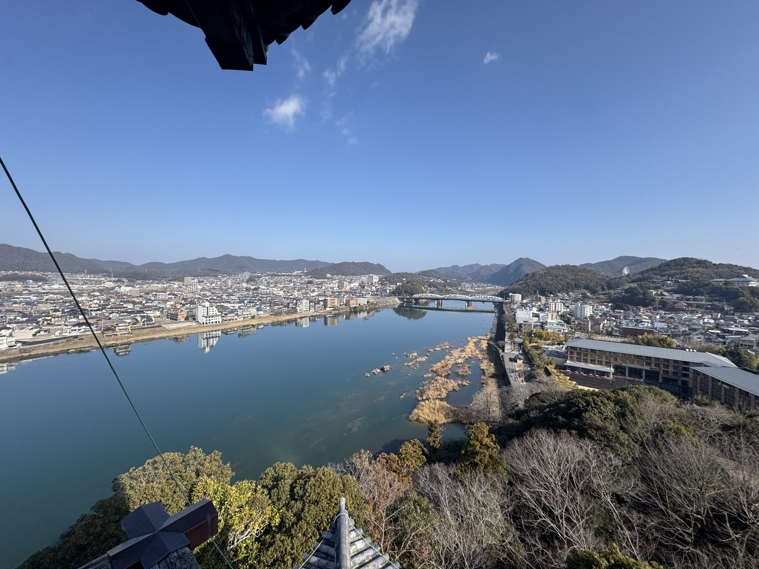 橋の奥側に見える山が鵜沼城跡じゃ!