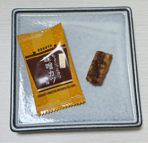 味噌カツ風味のソースを染み込ませた小さなカツ型の菓子。