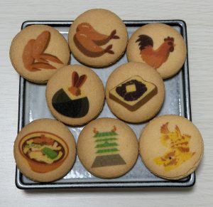 手羽先、エビフライ、名古屋コーチン、天むす、小倉トースト、味噌煮込みうどん、名古屋城天守閣、金のしゃちほこ、この全部で8つの名古屋名物が描かれているクッキーでござりまする。