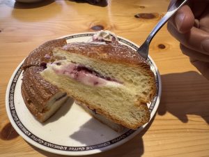 間にはブルーベリーソースとチーズクリームが挟まっておりまする